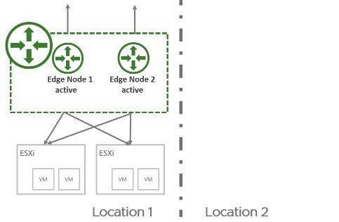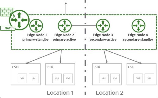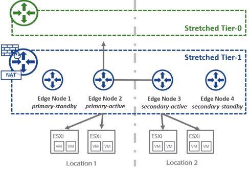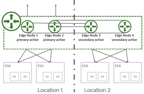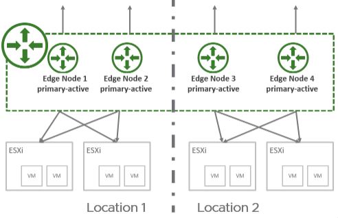 Если же на Т1 предусмотрены службы или хочется использовать пользовательский спан (отличный от Т0), одна из локаций выбирается как главная и остальные будут, соответственно, вторичными, а режим НА для Т1 при этом – только A/S. В результате весь трафик через этот шлюз будет проходить через активную Edge-ноду в главной локации: