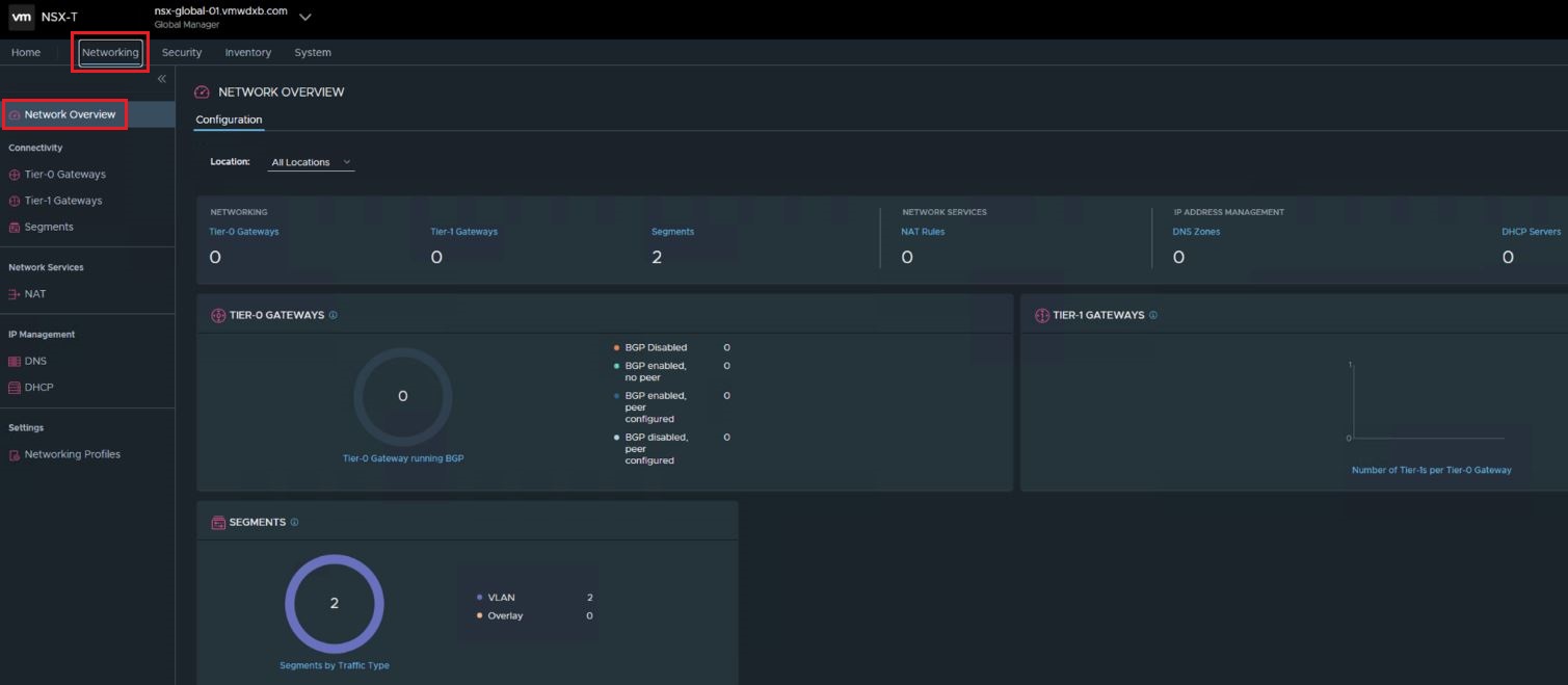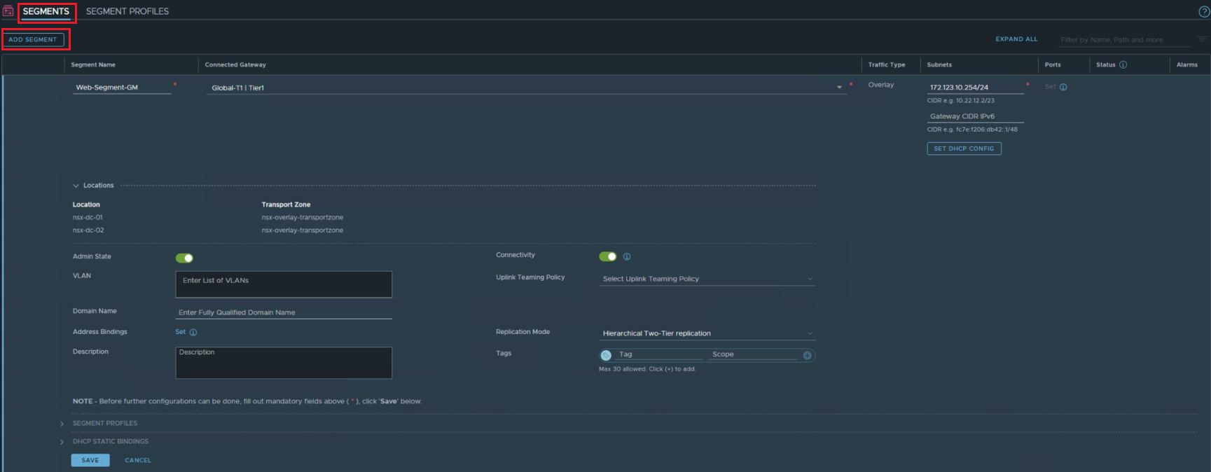 - На вкладке «Networking» выбираем «Segments» и нажимаем «Add Segment». Вводим его имя, выбираем тип подключения (в выпадающем списке ищем нужный шлюз Т0/Т1 или пока оставляем «None», если инициация сегмента произошла до момента добавления шлюзов), тип трафика («Overlay»/«VLAN», проставится автоматически, у нас – «Overlay») и локации (можно заполнить теми же локациями, что сконфигурированы на прикрепленном шлюзе, либо назначить дефолтную TZ, чтобы сегмент распространялся на каждую локацию):