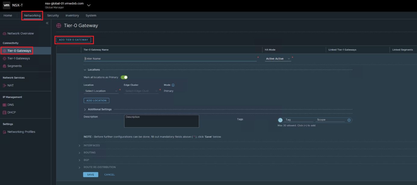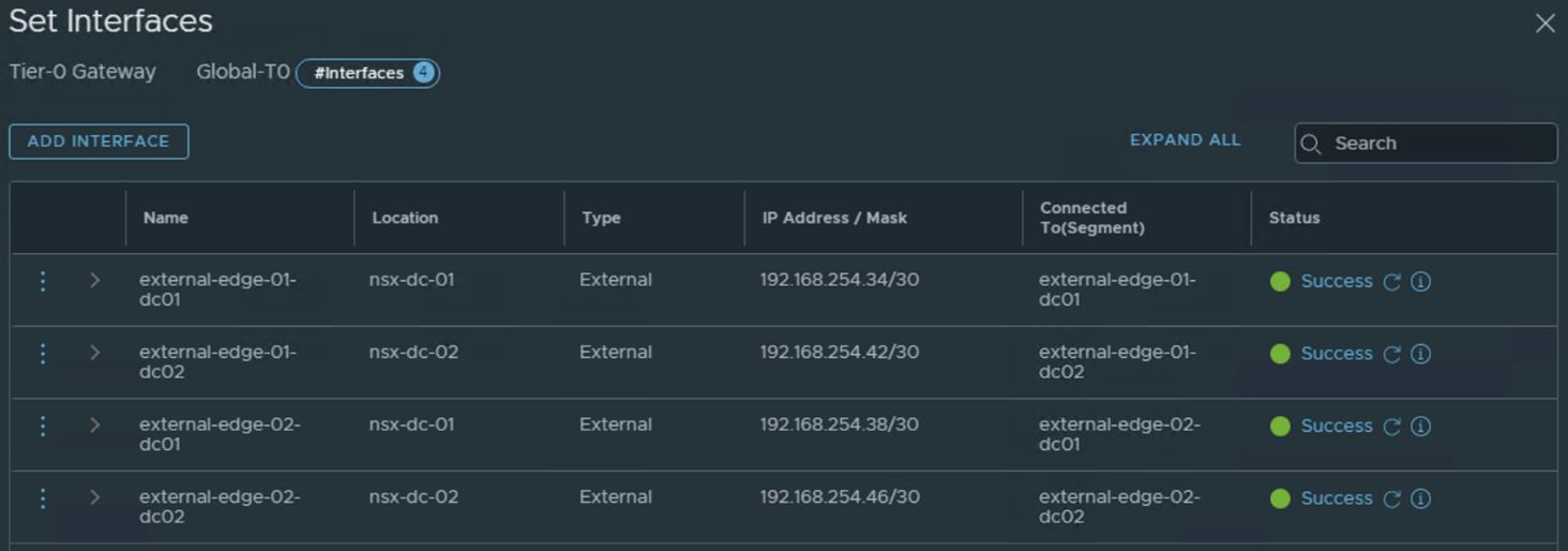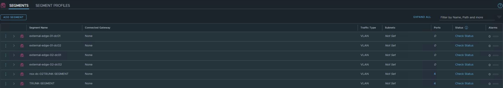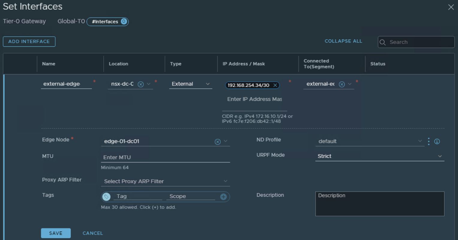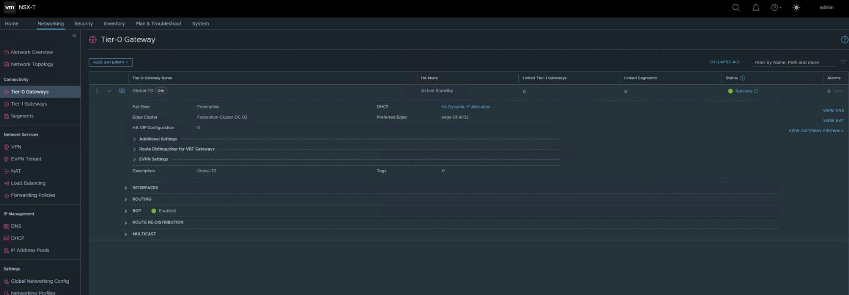 Важно! При создании Т0 из GM нужно сконфигурировать внешний интерфейс в каждой локации, на которую растянут этот Т0. Все эти интерфейсы следует подключить к созданному из GM сегменту, выбрав настройку «Connectivity» как «None» и «Traffic type» – как «VLAN». Настроенные на этих внешних интерфейсах Edge-ноды используются во внутренней связи локации, даже если в трафике северного направления нет нужды.
