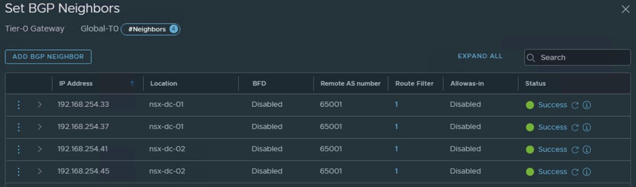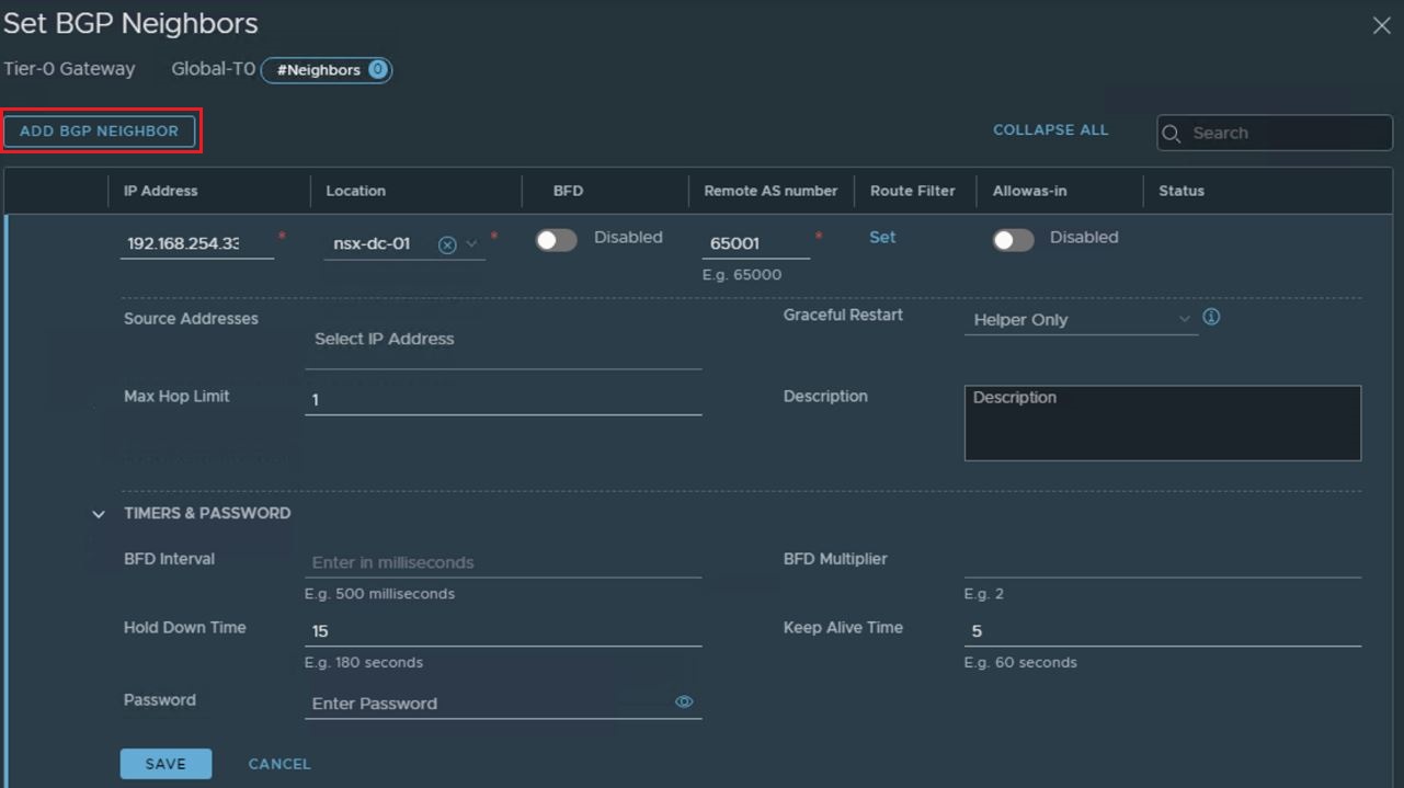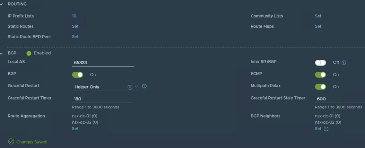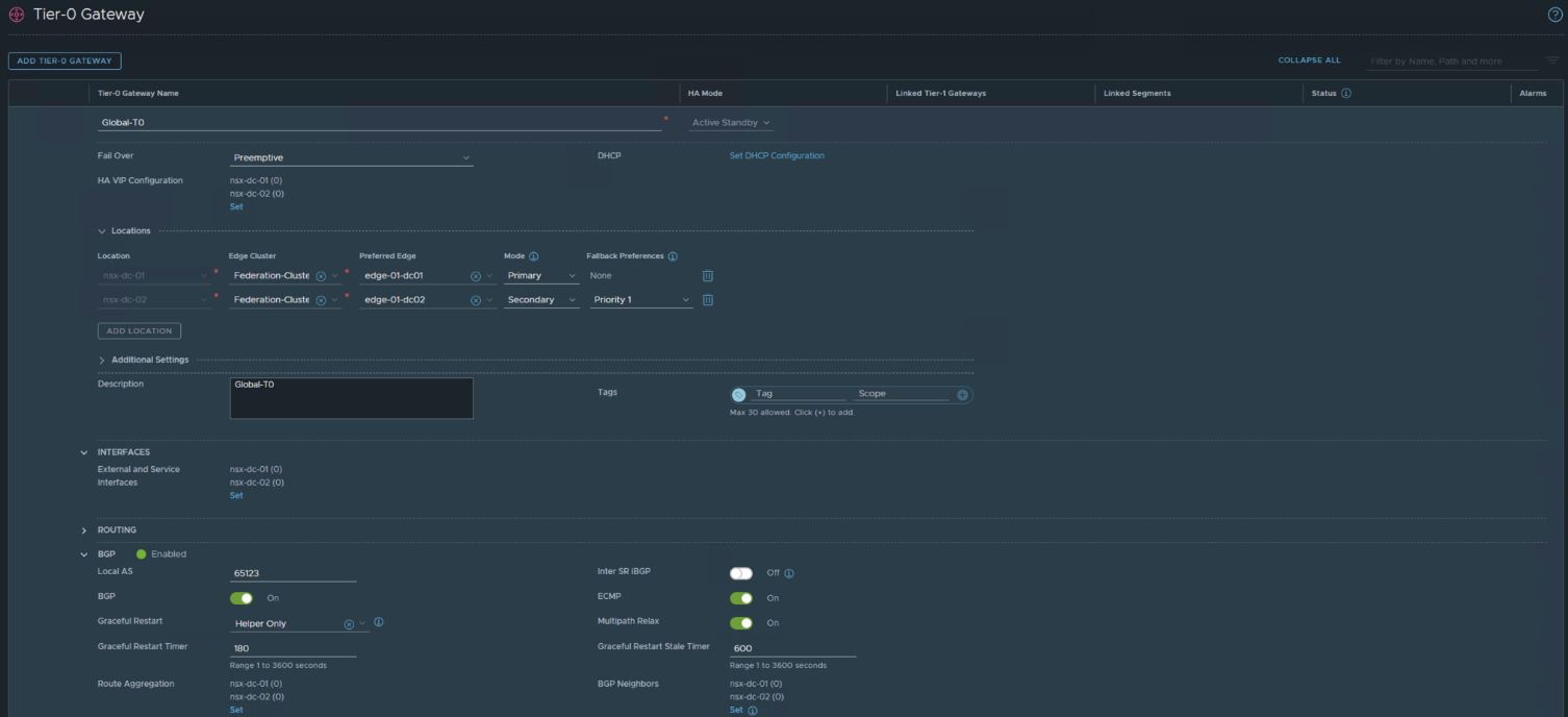 Далее раскрываем секцию «BGP», большинство настроек которого на Т0 из GM применяются ко всем локациям, и вводим туда стандартные назначения – все по аналогии с рекомендациями из наших предыдущих статей по теме NSX-T: