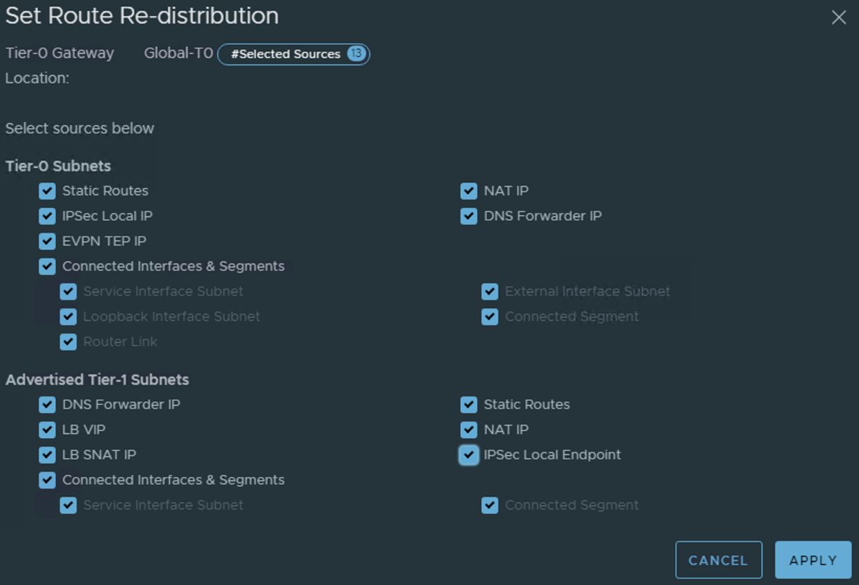 - Подсети Т0 (Static Routes/NAT IP/IPSec Local IP/DNS Forwarder IP/EVPN TEP IP/Connected Interfaces & Segments). В «Connected Interfaces & Segments» можно выбрать что-то из Service Interface Subnet/External Interface Subnet/Loopback Interface Subnet/Connected Segment или сразу несколько;