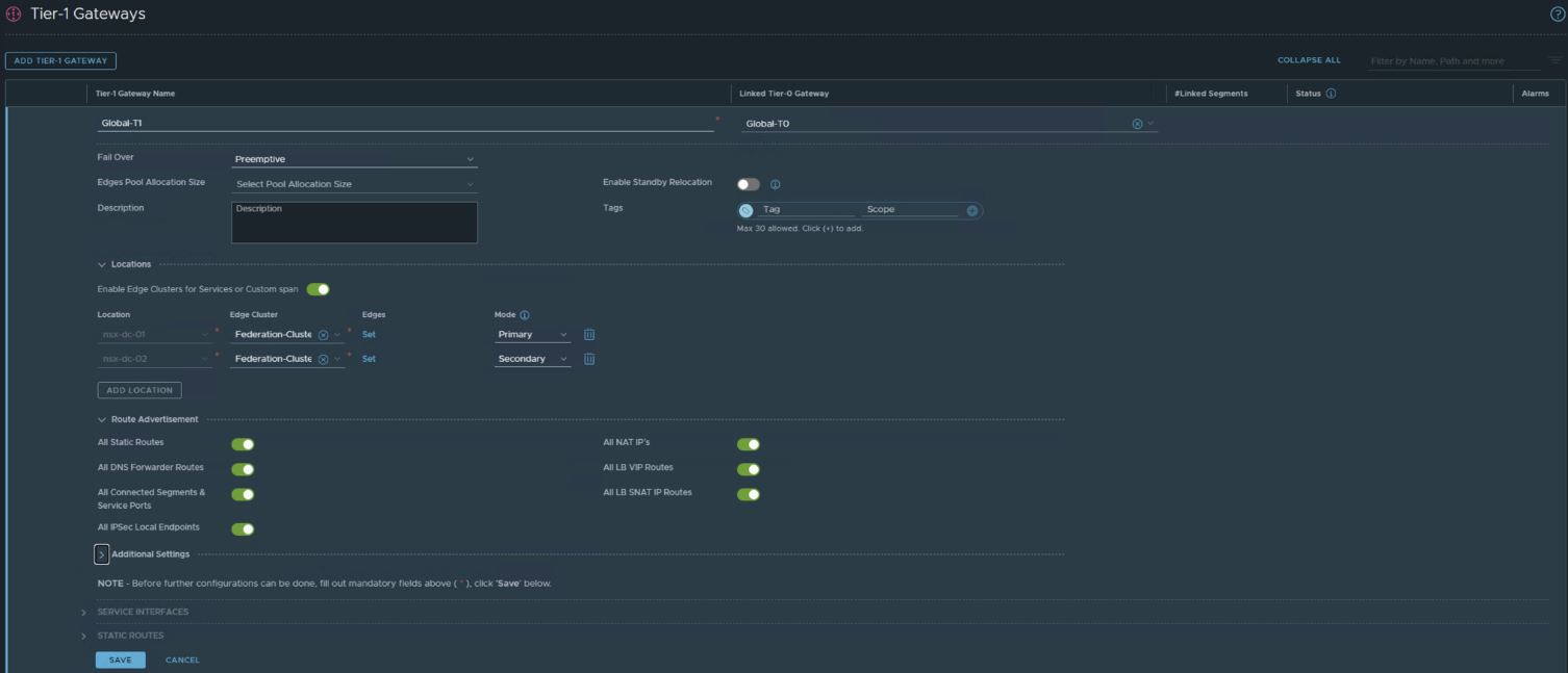 Чтобы получить представление о полном функционале, создадим Т1-шлюз, который будет предоставлять подключение для наших сетей и добавим в него несколько сегментов, которым суждено растягиваться по всем ранее назначенным локациям. К шлюзу Т1 переходим исключительно после создания Т0, а все теоретические сведения о его особенностях в контексте Федерации можно почерпнуть выше в соответствующем разделе.