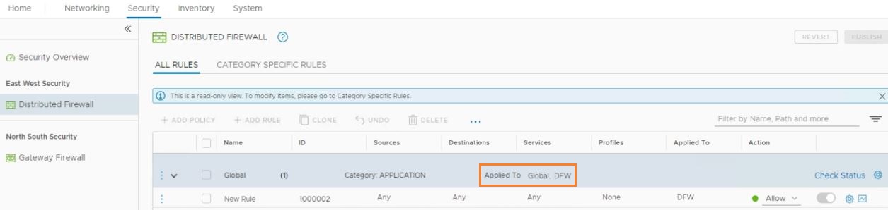 В UI заходим на «Security» – «Gateway Firewall» и определяемся с нужной категорией («Pre Rules», «Local Gateway» и «Default»). С первой и последней работать не получится – только с «Local Gateway». Делается это из вкладки «All Shared Rules», где следует кликнуть на название этой категории, или напрямую зайти на вкладку «Gateway Specific Rules».
