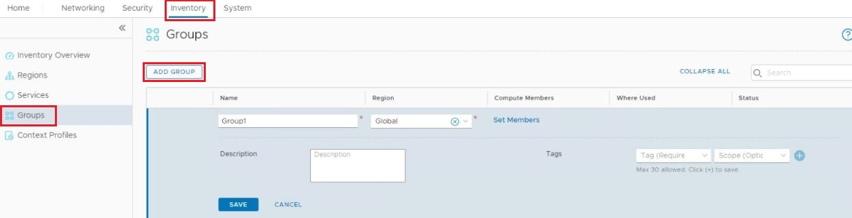 - Группы безопасности (создание групп любого, определенного разновидностью региона, типа – глобального, локального или регионального; динамических групп, опирающихся на динамические критерии, вроде тегов). На такие группы распространяются политики DFW на основе соответствия по полям источника правила и его назначения;