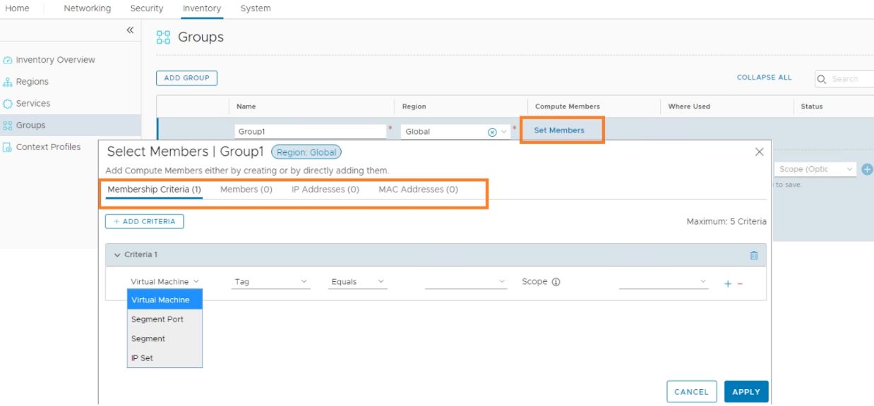Когда критерии назначены, можно выбрать членов группы в «Members» из таких общих классов: «Groups Segments», «Segment Ports», «VIFs», «Virtual Machines», «Physical Servers» или «Cloud Native Service Instances».